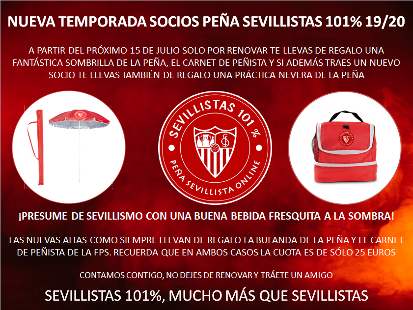Pronto vamos a hacer el primer aniversario desde que nacimos como peña y para celebrarlo hemos lanzado una exclusiva promoción para que hagas gala de tu sevillismo este verano. RENOVACIONES: Para los que ya son socios, si renuevan antes del próximo domingo día 12 de agosto se llevan de regalo esta fantástica toalla con nuestro …
